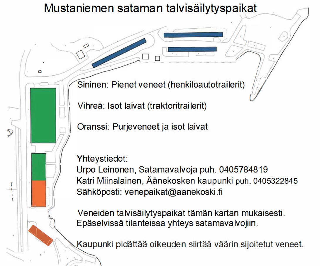 Veneiden talvisäilytyspaikat kartan mukaisesti. Epäselvissä tilanteissa yhteys satamavalvojiin.