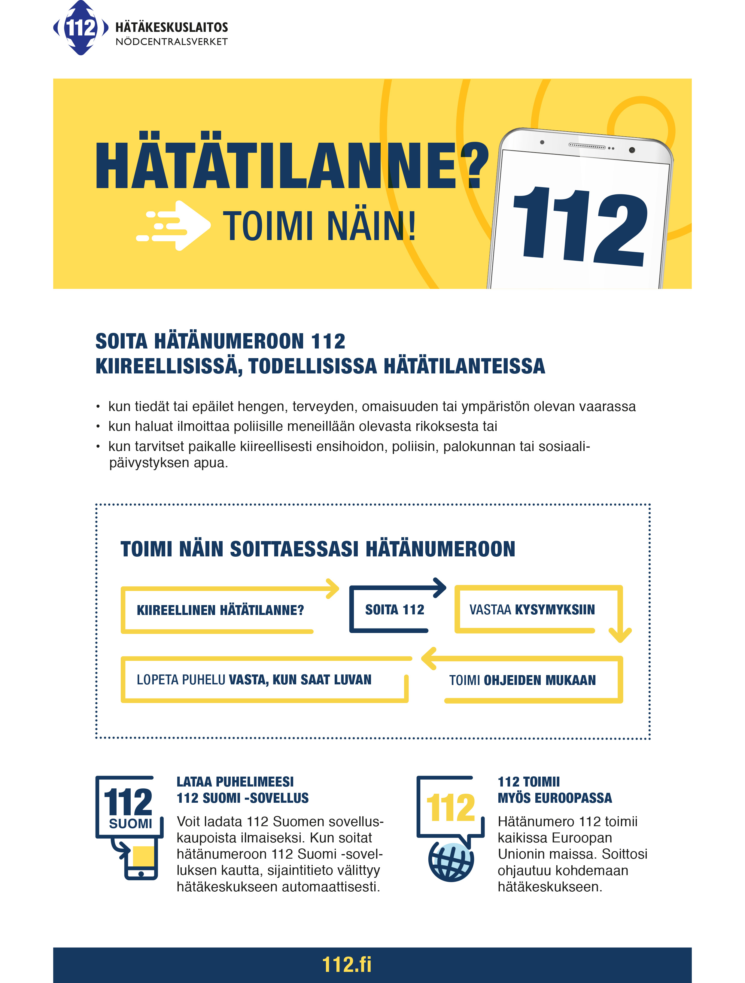 Tee turvallisuusteko ja lataa 112 Suomi -sovellus! 112-sovelluksen lataaminen puhelimeen on tärkeä osa jokaisen asukkaan omaa varautumista. Saat apua oikeaan paikkaan hätä- ja ongelmatilanteissa. Saat vaara- ja viranomaistiedotteet suoraan puhelimeesi. Sovelluksesta löydät myös päivystysnumeroita kiireettömään avuntarpeeseen.
