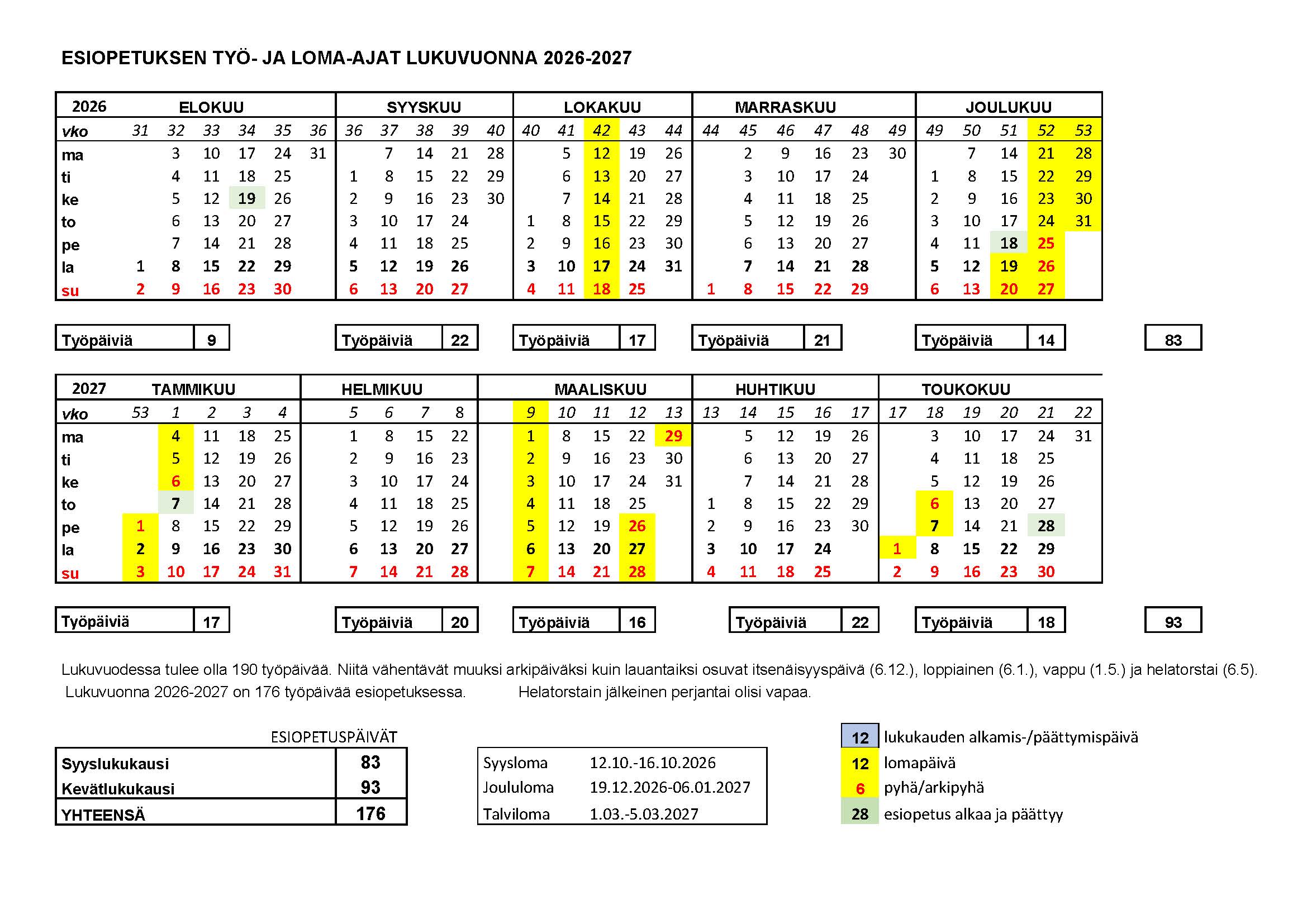 Lukuvuodessa tulee olla 190 työpäivää. Näitä vähentävät muuksi arkipäiväksi kuin lauantaiksi osuvat itsenäisyyspäivä ( 6.12), loppiainen (6.1), vappu (1.5), ja helatorstai. Koulu päättyy viikon 22 viimeisenä arkipäivänä. Lukuvuonna 2026-2027 on 188 työpäivää. Helatorstain jälkeinen perjantaisi olisi vapaa.