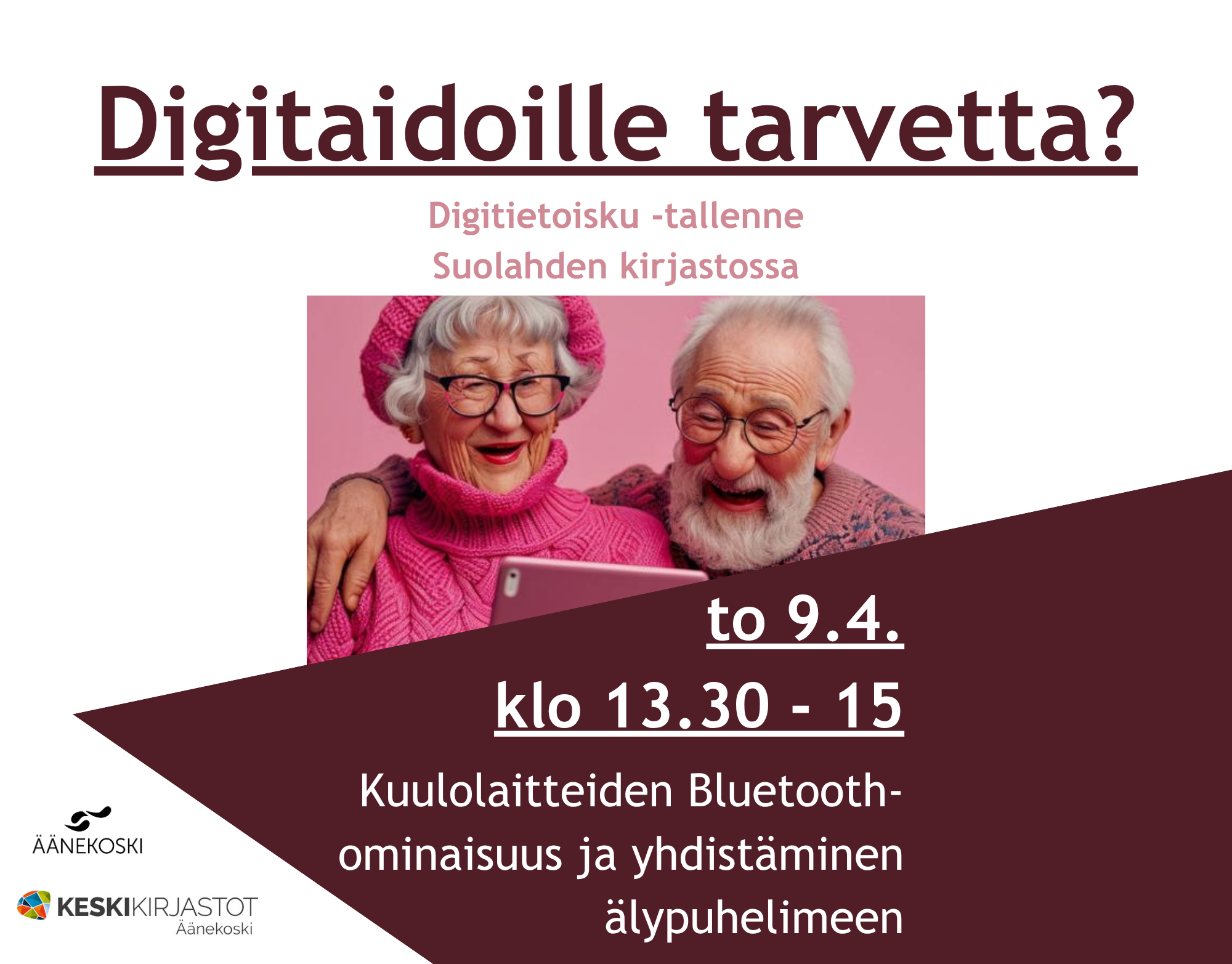 Digitietoisku -tallenne Suolahden kirjastossato 9.4. klo 13.30 - 15 Aihe: Kuulolaitteiden Bluetooth-ominaisuus ja yhdistäminen älypuhelimeen |