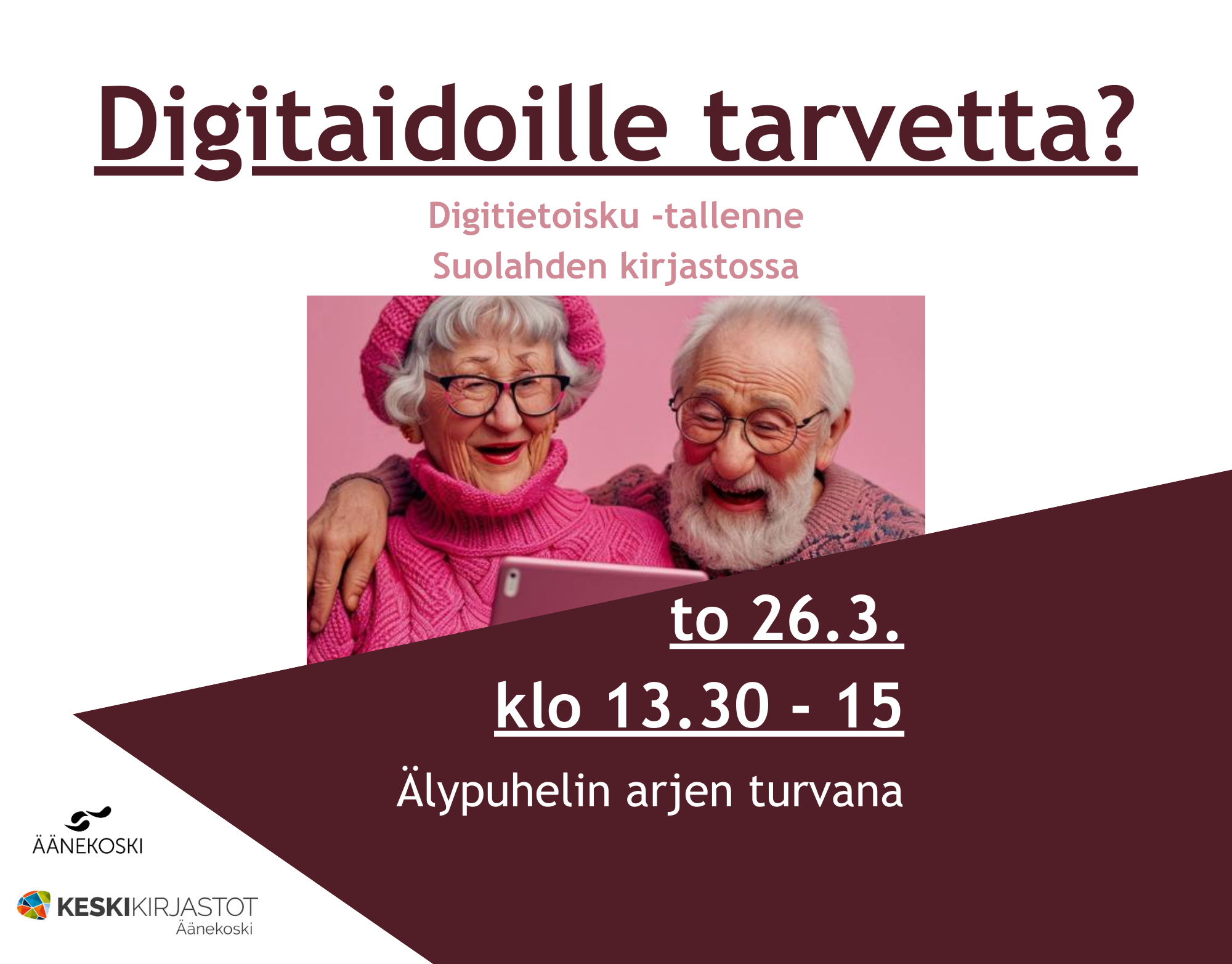 Digitietoisku -tallenne Äänekosken pääkirjastossaAihe: Älypuhelin arjen turvana ti 24.3. klo 17 - 18.30 |