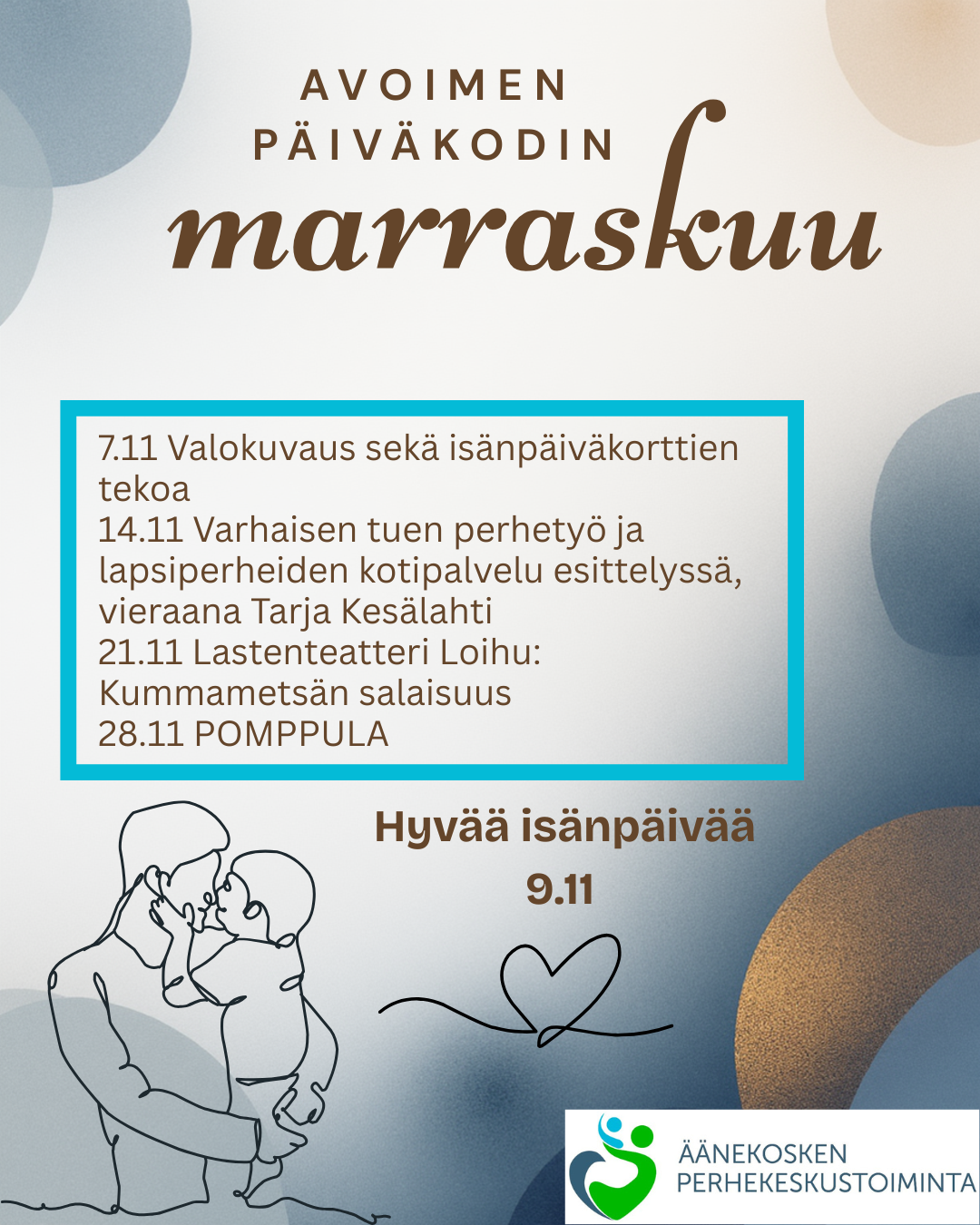 - 14.11. Varhaisen tuen perhetyö ja lapsiperheiden kotipalvelu esittelyssä, vieraana Tarja Kesälahti