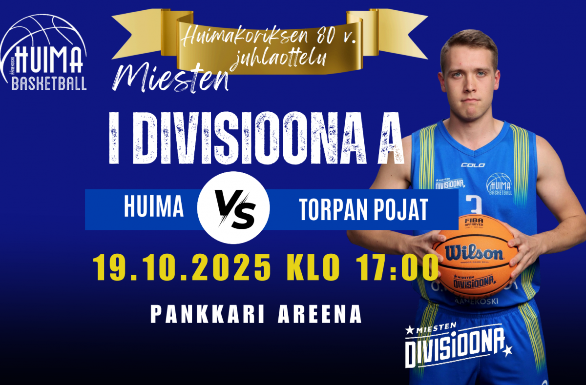 Huiman miehet pelaavat kauden ensimmäisen kotipelinsä ja samalla juhlistetaan koripallon 80-vuotista historiaa Äänekoskella. Vastaan asettuu Torpan Pojat Helsingistä ja luvassa on juhlatunnelmaa, vauhdikasta korista ja koko perheen urheiluelämys Pankkarilla.