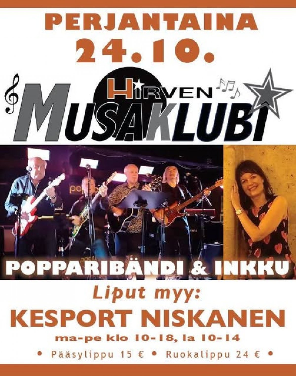 Nyt kaikki Hirven Musaklubille nauttimaan korkeatasoisesta kansainvälisestä kitaramusiikista Eki Paanasen ja Juha Ahtilinnan tahdittamina. Solistit myös huippuluokkaa. Hyvää musiikkia siis hyvän ruuan ja tanssin kera. Katso lisätietoja mm illan menu FB Hirven Musaklubi. Huomaathan, että tässä kuussa on poikkeuksellinen aika ei siis kuukauden viimeinen perjantai vaan toiseksi viimeinen. Lippujen ennakkomyynti on käynnissä Kesport Niskasen kassalla. Ryhmävarauksen Ari Peltonen 0400 345522. Ovet avautuvat klo 17, ennakkoon ostettu ruokailu alkaa 17.30 ja musiikki alkaa klo 19.00 ja loppuu klo 21.00. Tulossa varmasti hieno ilta, tervetuloa!