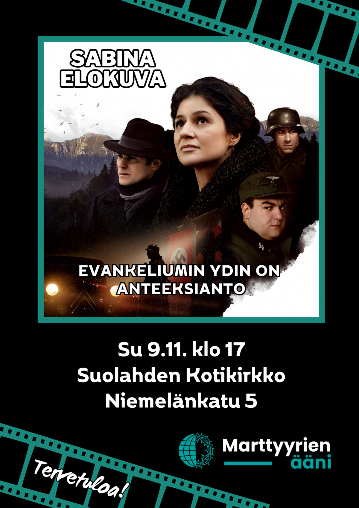 "Sabina" - koskettava, laadukkaasti toteutettu tositarina anteeksiannon voimasta natsiaikojen Romaniassa. IMDB 6.9, kesto 2h, ikäsuositus 13v. Tarjolla pientä leffasyömistä, vapaa pääsy (vapaaeht. maksu Marttyyrien Äänelle vainottujen lasten joululahjaan). Tervetuloa isänpäivän elokuvailtaan Suolahden Kotikirkkoon!