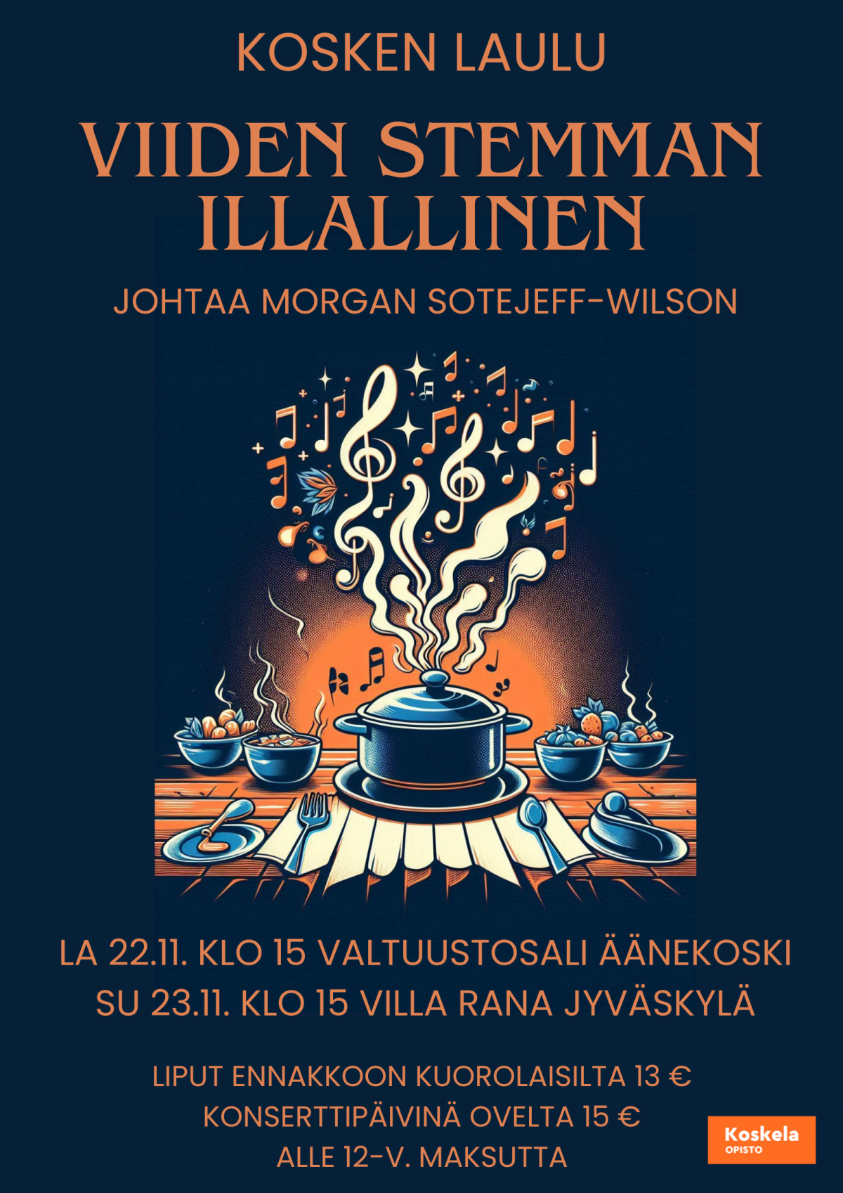 Lämpimästi tervetuloa nauttimaan kanssamme alkupalat, lämmin ruoka ja jälkiruoka musikillisina annoksina. Pääkokkina ja arvostettuna master cheffinä toimii Morgan Sotejeff-Wilson.