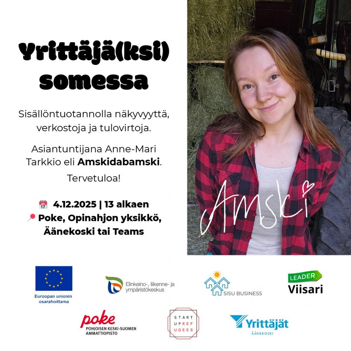 Sukella sisällöntuotannon ja vaikuttajamarkkinoinnin maailmaan! Pohjoisen Keski-Suomen ammattiopisto (POKE) ja SISU Business -hanke kutsuu yrittäjyydestä ja sosiaalisen median sisällöntuotannosta kiinnostuneet maksuttomaan tilaisuuteen.