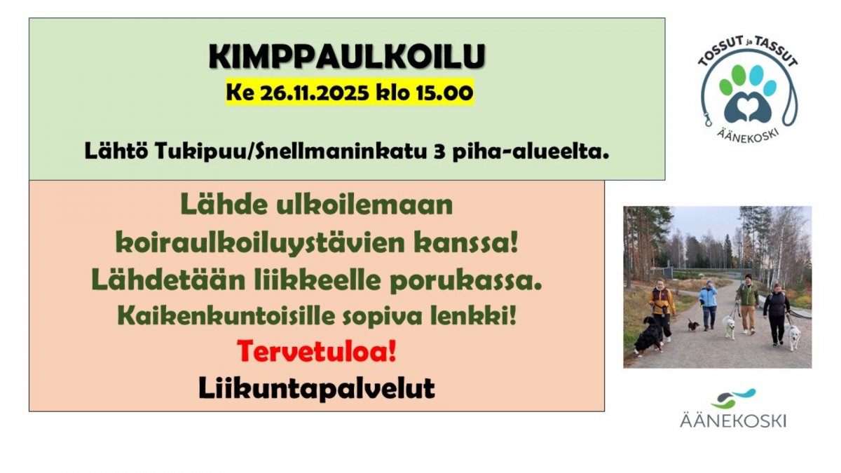 Kimppaulkoilu koiraulkoiluystävien kanssa ke 26.11.2025 klo 15.00.