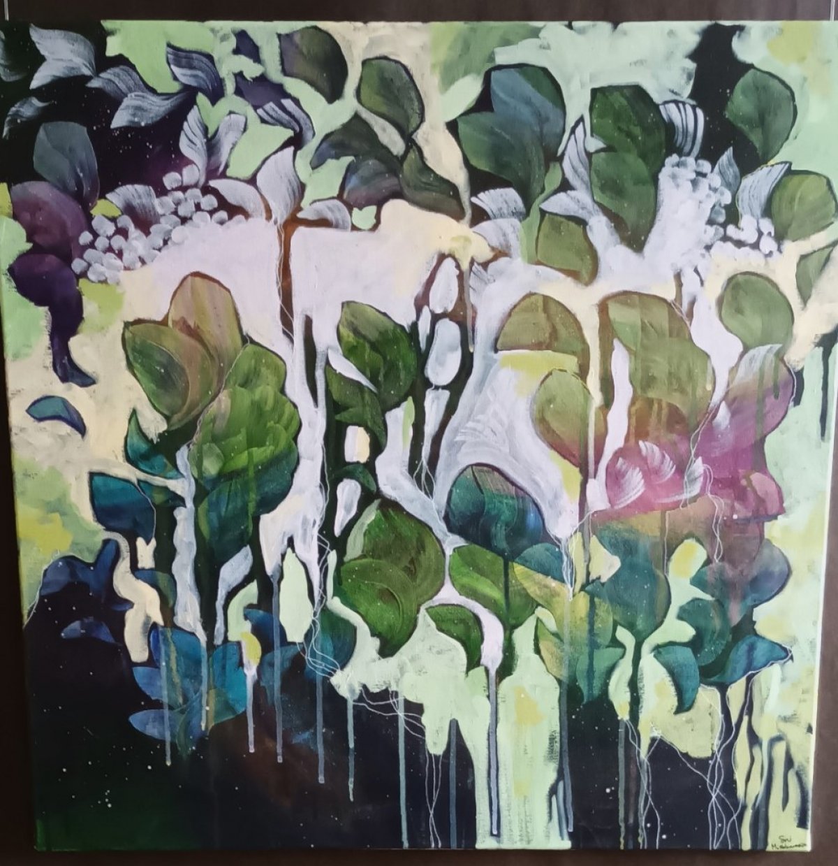 Taiteilijatapaamisessa Kuhina-näyttelyn taiteilija Soni (Sonja) Miekkavaara kertomassa maalauksistaan ja inspiraation lähteistään.