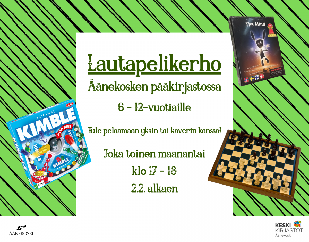 Lautapelikerho on tarkoitettu 6 -12 -vuotiaille. Kerhossa pelaillaan rennosti lautapelejä ja mukaan mahtuu yksin tai vaikka kaverin kanssa. Peliseura on aina taattu!