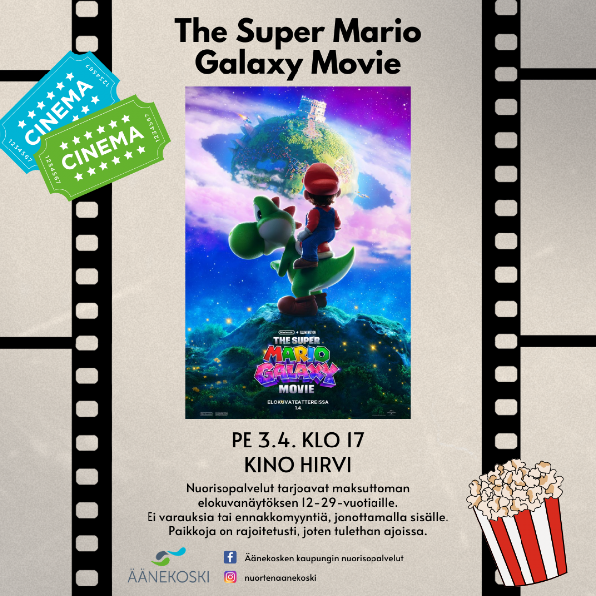 Äänekosken nuorisopalvelut tarjoavat maksuttomia elokuvanäytöksiä 12-29-vuotiaille Kino Hirvessä. Seuraava ilmaisnäytös on perjantaina 3.4. klo 17. Tällä kertaa näytöksenä on animaatioelokuva The Super Mario Galaxy Movie. Näytöksiin ei voi ostaa tai varata lippuja etukäteen. Paikkoja on rajoitetusti, joten menethän ajoissa paikalle jonottamaan. Ota siis kaverisi mukaan ja suuntaa Kino Hirveen nauttimaan ilmaisesta elokuvanäytöksestä! HUOM! Elokuvanäytöksissä ei ole paikalla nuorisotyöntekijöitä, ole tarvittaessa yhteydessä elokuvateatterin henkilökuntaan näytöksen aikana.