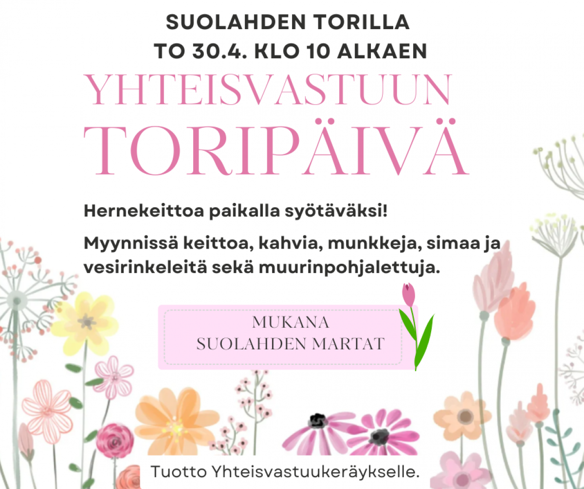 Suolahden torilla on paikan päällä syötäväksi hernekeittoa. Keitosta vapaaehtoinen maksu. Myynissä muurinpohjalettuja, munkkeja, simaa, vesirinkeleitä ja kahvia.