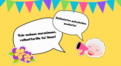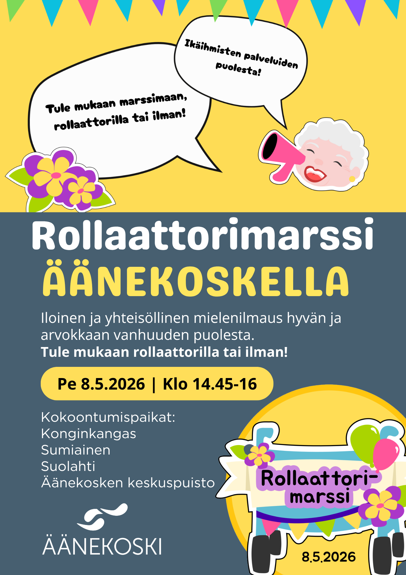 Useissa kaupungeissa ja kunnissa eri puolilla Suomea ja Keski-Suomea järjestetään perjantaina 8.5.2026 klo 15-16 Rollaattorimarssi, jonka tarkoituksena on tuoda esiin hyvää ja arvokasta vanhuutta. Iloinen ja yhteisöllinen mielenilmaus on osoitus ikääntyneiden asukkaiden aktiivisesta omaehtoisesta toiminnasta, ilosta ja voimasta. Tilaisuus on avoin kaikille, tervetulleita ovat kaikenikäiset ja -kuntoiset, rollaattorilla tai ilman.