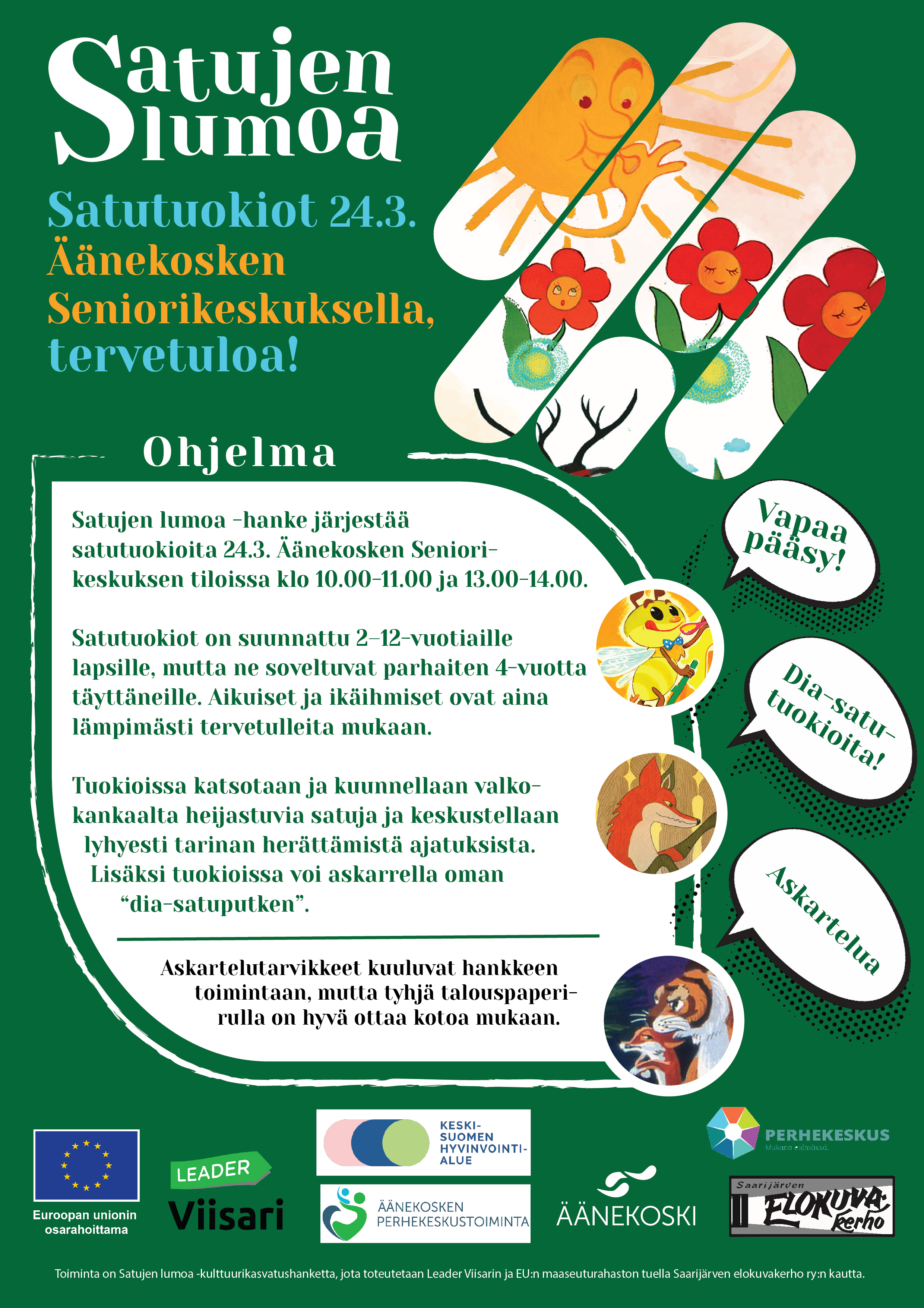 Satujen lumoa -Leader-hanke järjestää yhteistyössä Äänekosken kaupungin, Pohjoisen Keski-Suomen ammattiopiston, Keski-Suomen hyvinvointialueen ja Äänekosken perhekeskustoiminnan kanssa avoimia ja maksuttomia satutuokioita.