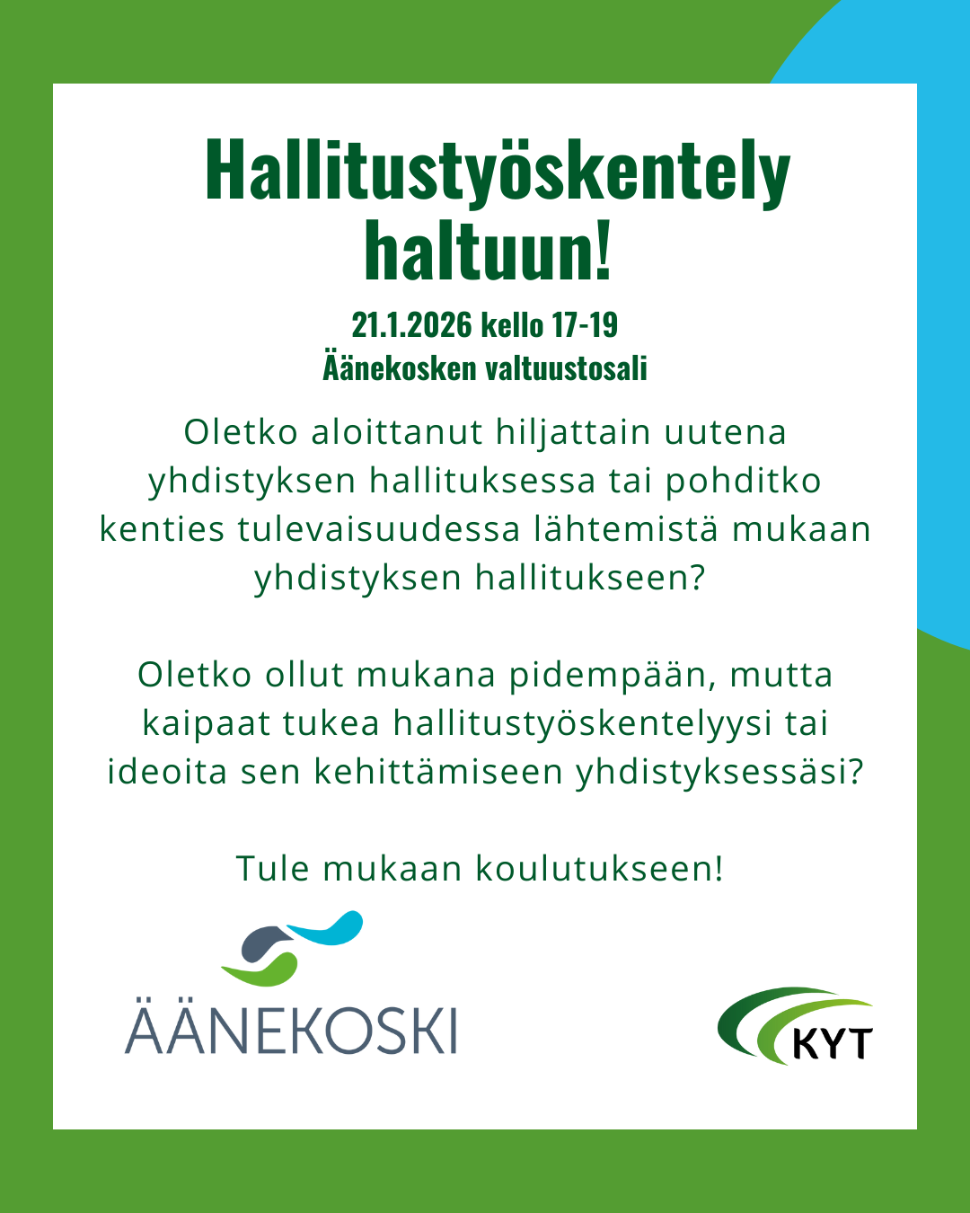 Oletko aloittanut hiljattain uutena yhdistyksen hallituksessa tai pohditko kenties tulevaisuudessa lähtemistä mukaan yhdistyksen hallitukseen? Oletko ollut mukana pidempään, mutta kaipaat tukea hallitustyöskentelyysi tai ideoita sen kehittämiseen yhdistyksessäsi? Tervetuloa koulutukseen ke 21.1.2026 klo 17-19 Äänekosken valtuustosaliin.
