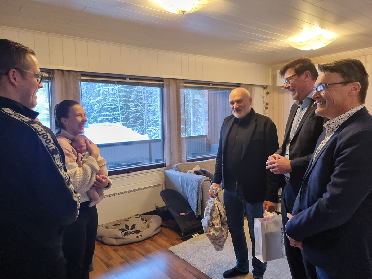 Vuoden ensimmäinen vauva on kaupungin kummilapsi ja häntä muistetaan perinteisesti kummilusikalla ja muilla lahjoilla. Kaupunginjohtaja Matti Tuononen, kaupunginhallituksen puheenjohtaja Kari Kiiskinen ja valtuuston puheenjohtaja Tommi Lunttila kävivät tänään 15.1.2026 tervehtimässä Jämsenin perhettä. Äänekosken vuoden ensimmäinen vauva syntyi 1.1. Noora ja Otto Jämsenin perheeseen ja 2-vuotias Senni on nyt isosisko. Lämpimät onnittelut koko perheelle!