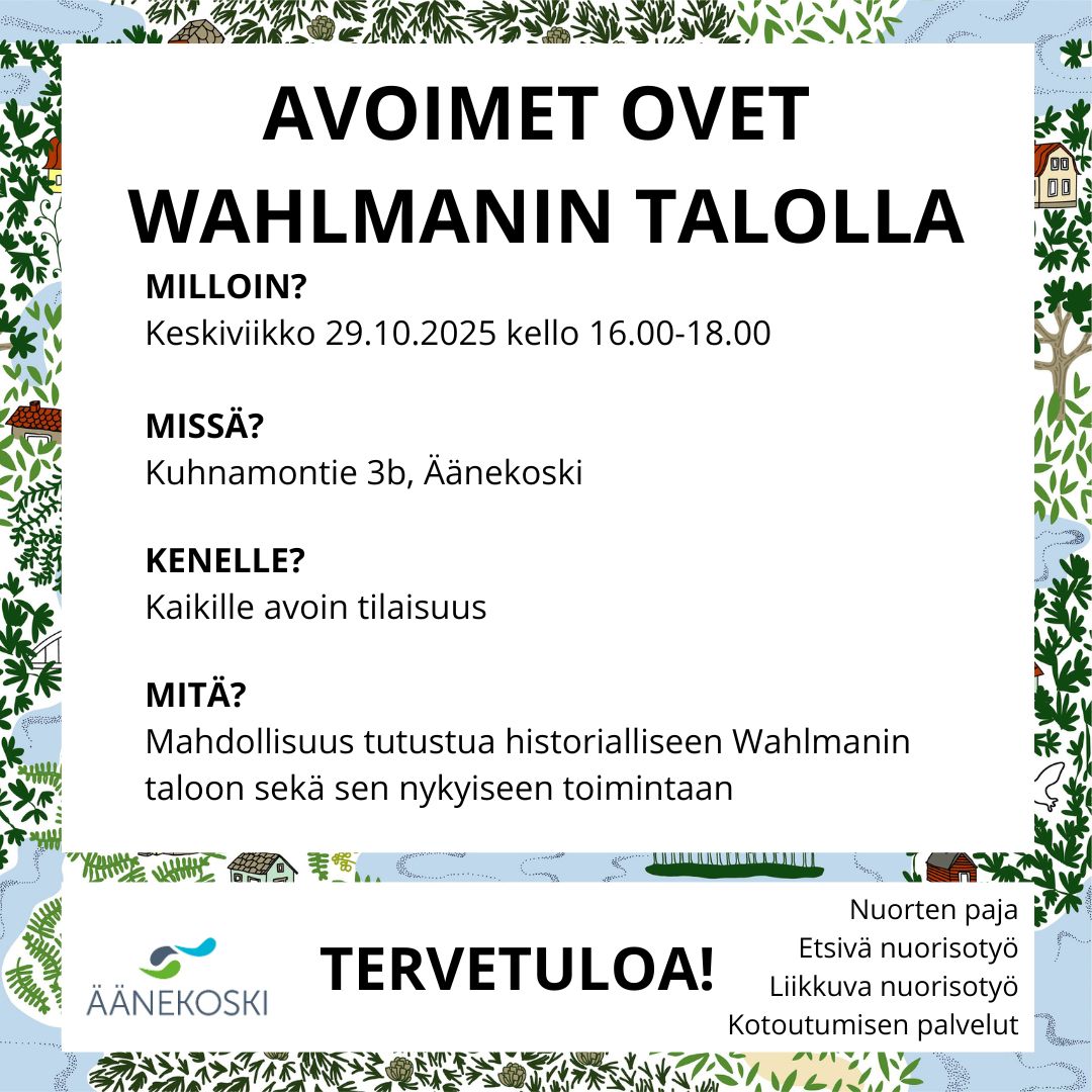 Asukkaiden toiveesta järjestämme uudestaan tutustumismahdollisuuden historialliseen Wahlmanin taloon ja sen nykyisiin toimintoihin. Wahlmanin talon avoimet ovet ke 29.10.2025 klo 16-18, os. Kuhnamontie 3b, Äänekoski. Tervetuloa!
